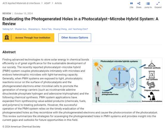 近日,yl23411永利集团官网俞亚东教授以第一作者、通讯作者,南京工程学院为第一署名单位,在国际权威期刊《ACS Applied Materials & Interfaces》上发表题为“Eradicating the Photogenerated Holes in a Photocatalyst–Microbe Hybrid System: A Review”的学术论文。《ACS Applied Materials & Interfaces》是美国化学会旗下材料、能源类顶级期刊,中科院二区TOP期刊,影响因子为8.3。