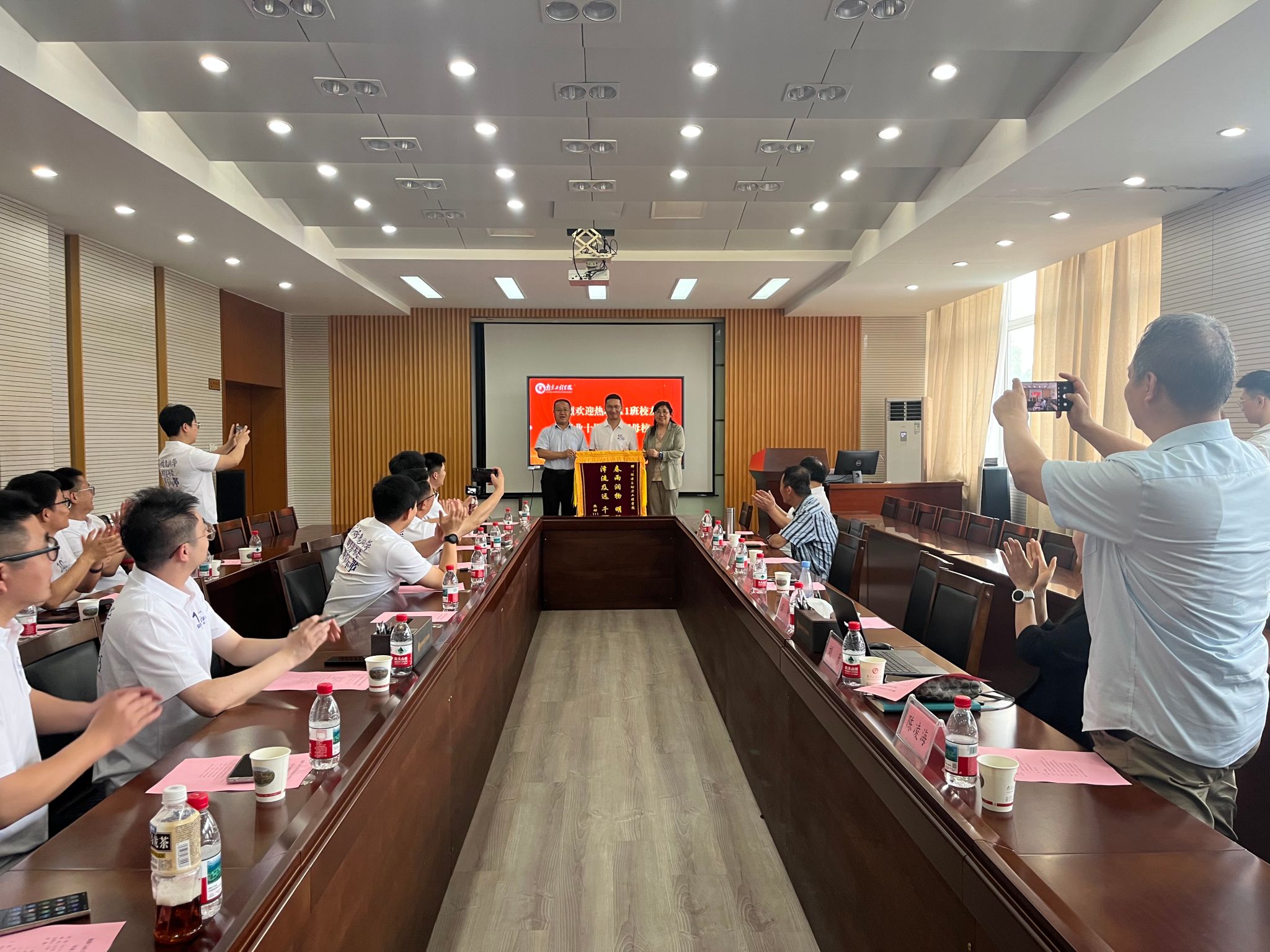 座谈会上,校友们首先观看了学校事业发展的宣传片,感受母校十年来的蓬勃变化。薛锐代表学院向重返母校的校友表示热烈欢迎,并从学院的发展历程、师资队伍、教学资源、人才培养等方面向校友们进行了介绍。他希望校友们多关心和支持母校的发展,与学院保持密切联系与互动。校友们为学院和班主任王顺老师赠送了写有 “春雨润物,明德育才,泽流及远,千里思源”的锦旗,表达对母校和恩师的由衷感激。校友们还精心搜集并循环播放了在校期间的学习、出游、聚餐和毕业照片剪辑视频。一个个熟悉的画面唤起了大家对青春岁月的无限回忆,感慨万千。座谈会上,王顺老师逐一介绍每位校友的近况,语气中满是自豪与欣慰。校友们也纷纷回忆起在校时的点滴,尽管如今从事的行业各异,但母校打下的坚实基础成为他们不断前行的力量源泉。他们表示,将永远铭记母校的培养和老师的教诲。