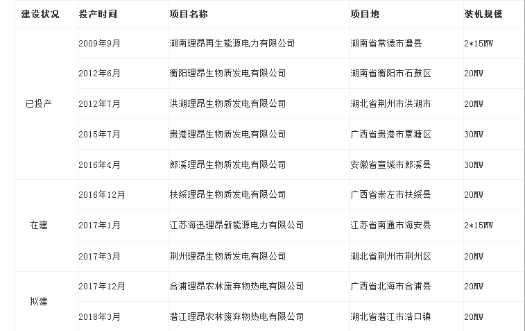 公司已建成湖南澧县、湖南衡阳、湖北洪湖、广西贵港、安徽郎溪五个生物质发电项目,总装机容量为130MW,正在建设广西扶绥、江苏海安、湖北荆州等项目。截止2016年6月30日,公司共处理农林废弃物330万吨,为国家贡献清洁电能26.2亿度,为农民创收11亿元,节约标煤140万吨,减排二氧化碳180万吨。
