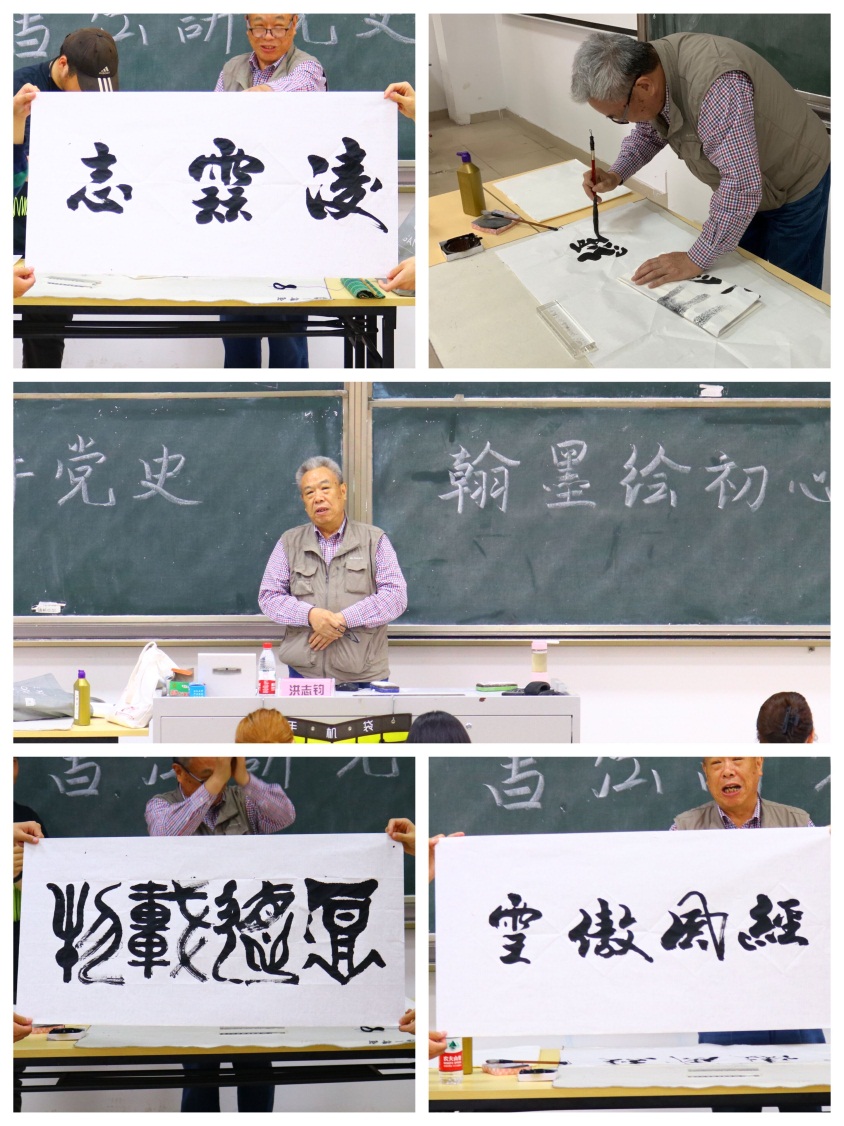 洪老师现场挥毫书写,运用楷书、行书、隶书、草书等多种书法风格,将党的革命、建设、改革,脱贫攻坚与乡村振兴等重大历史节点融入其中,百年峥嵘路,跃然笔墨间,给大家带来了一场视觉的盛宴,一次精神的洗礼。“今年是中国共产党成立100周年,作为一名68岁高龄的老党员,我仍然在不断学习党的百年历史,从而汲取奋进力量!”洪老师感慨从中国共产党成立到中国特色社会主义新时代,中国共产党为实现中华民族伟大复兴而不懈努力奋斗,他激励同学们要牢记先辈们为了党的事业勇于奋进的精神,珍惜现在美好的生活,早立凌云志、更怀报国心,努力学习成为祖国的栋梁。“这样的党课形式走‘新’更走心,可以在学习传统书法文化的同时,学习党的历史,提升我们的民族自信。”课程结束以后同学们这样称赞道。