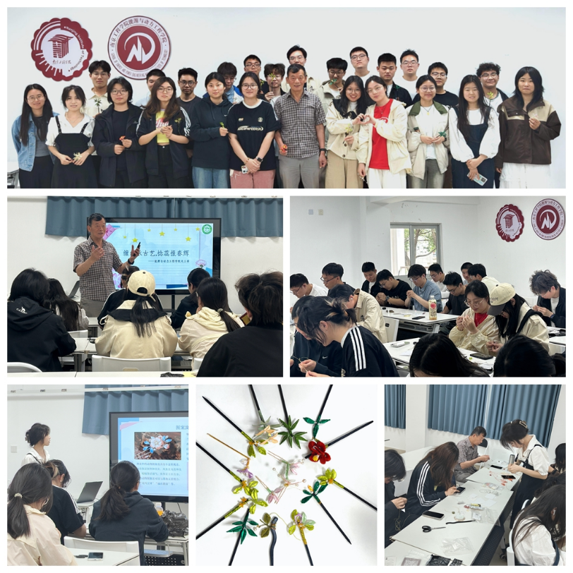 活动伊始,关工委辛洪祥老师向同学们介绍了母亲节的由来和意义,他语重心长地鼓励同学们:“母亲是人生中最温暖的港湾,从我们呱呱坠地,到成长求学,母亲始终默默付出、无私奉献。希望大家不仅要以精美的缠花表达爱意,更要通过刻苦学习回报母亲的养育之恩,将来以所学本领报效祖国母亲。”随后,“植茁”德育工作室的赵贤同学化身非遗文化讲解员,通过图文并茂的展示,带领大家回溯缠花这一传统技艺的千年历史。从宫廷贡品到民间雅艺,从繁复工艺到美好寓意,同学们沉浸在非遗文化的魅力中,不时发出阵阵赞叹。在动手实践环节,大家手持细铜丝与彩线,在工作室同学的指导下,经过数小时的精心制作,一朵朵造型别致的缠花发簪在指尖绽放,每一件作品都寄托着对母亲的美好祝福。“制作缠花时,我总会想起妈妈为我操劳的模样,希望妈妈能被岁月温柔以待,我在学校会好好学习,不让妈妈操心。”参与活动的能动类2406班梁佳佳同学捧着发簪感慨道。