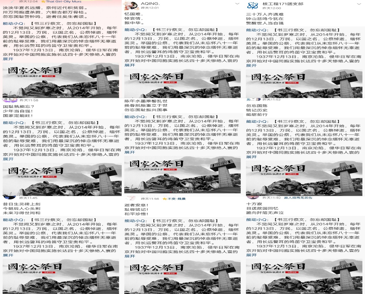 书写三行祭文,传达祭奠深情。“那年乱世如麻,愿你们来世,拥有锦绣年华……”“国之殇,民之痛,吾辈自强……”国家公祭日前夕,学院发起“国家公祭忆国难,三行祭文悼哀思”网络接力活动,号召广大青年团员以三行祭文的形式,在微博、QQ等新媒体抒发祭奠深情。活动发起仅一天时间内,得到了各团支部的积极响应,百余名学生运用不同方式,诉说着自己的爱国之情。三行祭文,虽只有短短三行,却字字真切,满怀真情,表现了能动学子对国家、对党的忠诚热爱,也展现出当代青年的责任担当。