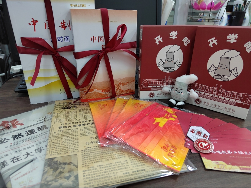 在学院迎新点,由立德、劝学、笃行、修身、励志、奋斗等六个版块组成的“我的大学”巨幅展架赢得新生关注,展架上共计420条人生格言,每条格言对应一个礼盒。盒子上印有学校校训、校园精神、公众号二维码,盒子里既有口罩等日常防疫用品,也有学院干部教师手写的祝福明信片,还有“艺术课体验券”、“党史书籍兑换券”、“合影券”等等意外和惊喜,新生们纷纷挑选自己喜爱的名言警句,将其作为开启学涯的“密钥”,勉励自己走好大学生涯“第一步”。另外,学院为每一名新生精心准备出生当天发行的原版“老报纸”,打造有力量、有历史、有共鸣、有生命的鲜活思政课;丰富校园文化元素的设计、融合,以火力发电厂冷却塔为原型设计吉祥物“能宝”、与院徽一起赠与新生,强化身份认同、文化认同,构建校园文化传播新阵地、新载体。