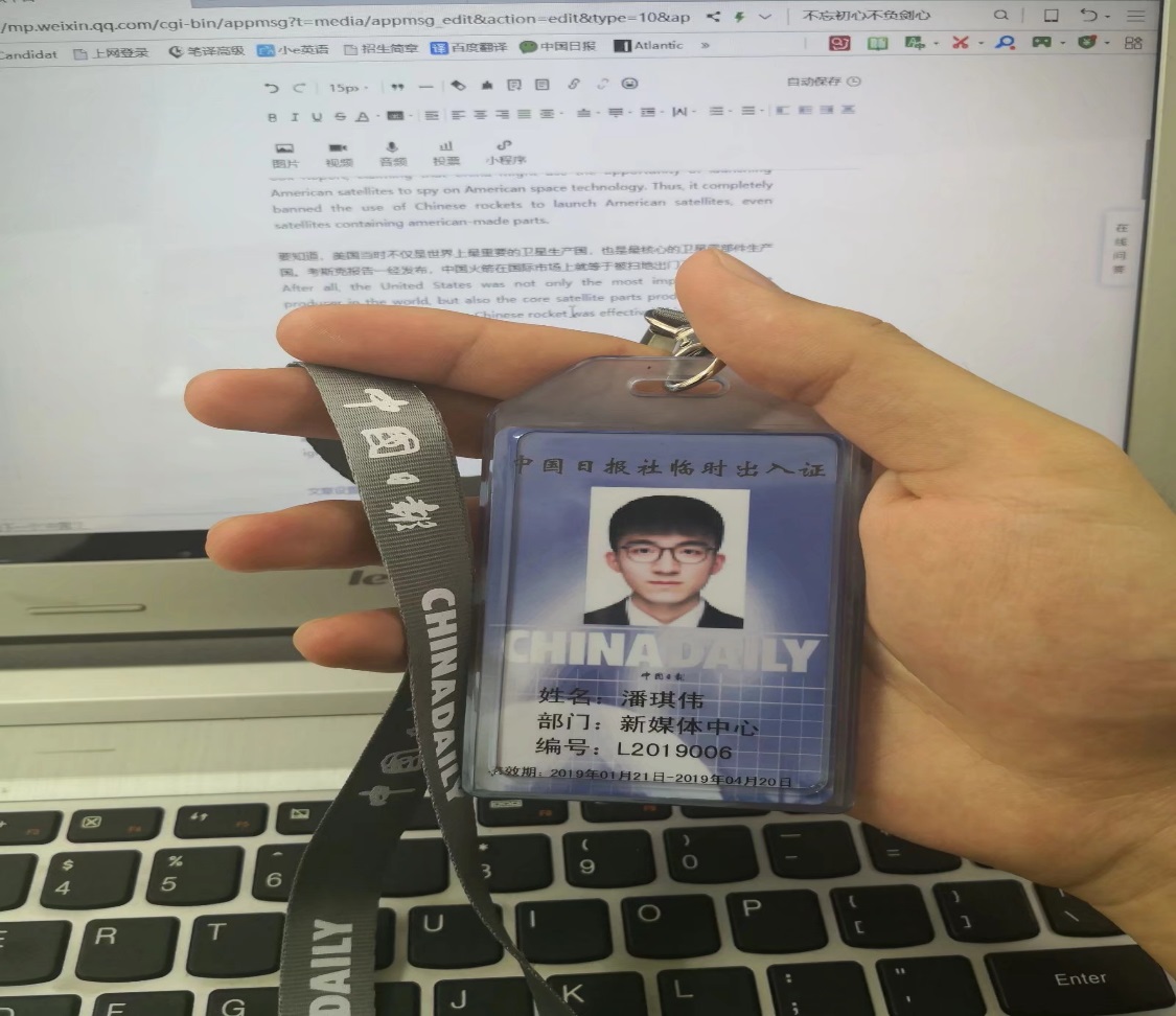 早在去年12月底,China Daily发布寒假实习生的招聘信息,抱着试试看的态度,精心修改简历、认真完成线上笔试,幸运的是,1月2日,他收到了录用通知。北京实习的日子,忙碌而充实。在报社老师的指导下,挖掘双语新闻、翻译、排版、制作微信是每天的主要工作内容。闲暇之余,用阅读充实自己,傅莹、三毛、王小波等各类名家作品倒也读得有滋有味。回顾这段经历,他在朋友圈里写下这样一段话,“每当打开China Daily双语新闻微信公众号,看到实习生那栏写着自己名字的时候,那种收获的甜早就胜过了独立北漂的苦。我愈发相信机会总是垂青有准备的人,正是因为知道自己想要从事什么样的行业,这些年我从未放弃英语学习,有梦想没什么了不起,真正实现过自己梦想的人才最了不起。”