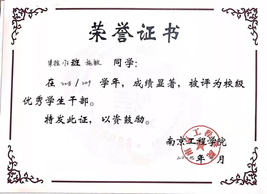 夜色中点点繁星和深夜依1旧明亮的灯见证着一切的勤奋和坚持。入学以来,她的智育成绩和综测排名均在专业名列前茅,凭借自己的努力先后获得了国家奖学金、国家励志奖学金,校级特等奖学金,校级一等奖学金等,在大一大二时便顺利通过了英语四六级,全国以及江苏省计算机一、上级。此外,她还参与了《电动车车载自动伸缩雨棚》、《基于云数据库的过程模拟和数据平台》等多个大学生科技创新项目,并且顺利结题。学习以求进步,尝试以求超越,博学进取,行稳致远。优异的学习成绩和充实的课余生活离不开她每一次的勇敢尝试和脚踏实地的辛勤努力。